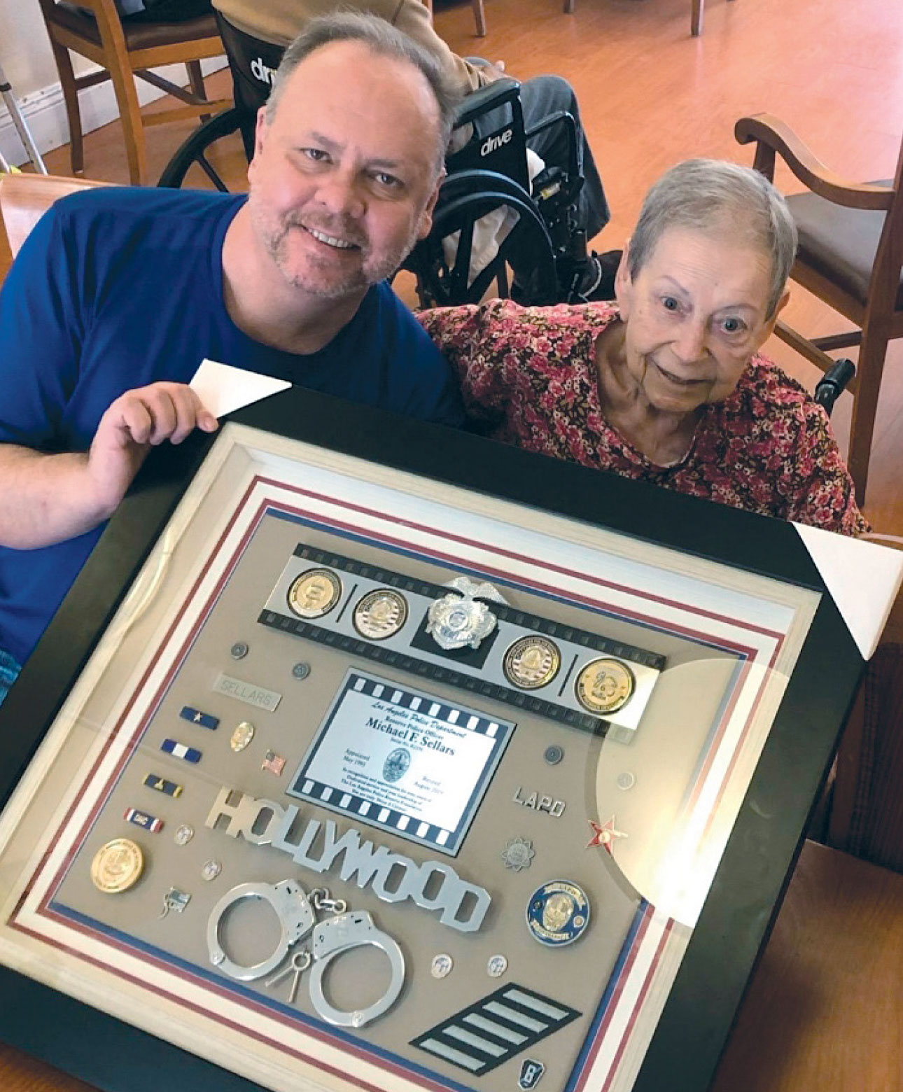 Sellars upon his retirement in 2019, showing his mother the shadowbox honoring his 26 years of service