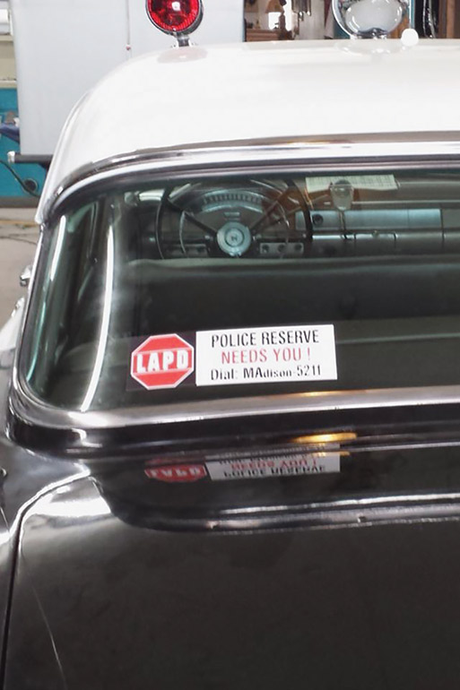 The final touch was recently added: He got an original sticker on eBay and then had it replicated. LAPD Specialist Mark Galoustian helped him from long distance: One of Mark’s lights is on the roof. “The lights are red/red, correct for 1957. There were no ambers until 1964,” Mark says.
